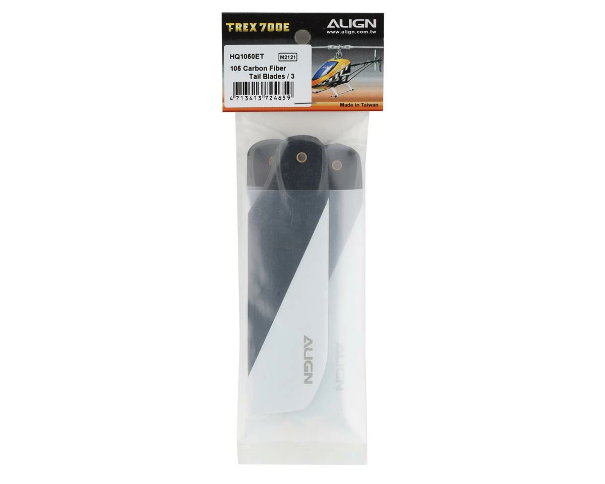 A set of Align Tri-Blade 105mm Tail Rotor Blades. Designed for use with the T-Rex 700 family of helicopters, when equipped with the Tri-Tail upgrade kit. Can also be used with other 700 class helicopters that require a Tri-Blade tail set.