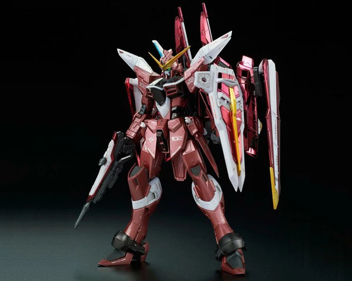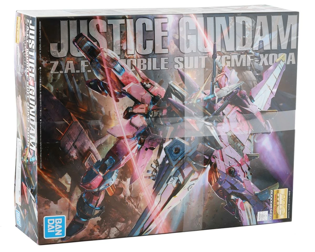 Bandai Justice Gundam “Gundam SEED” MG ZGMF-X09A Model Set. This model features extreme detail and features the beam rifle, shield, dual beam sabers, interchangeable hands for posing options, and a fully-functional Fatum Unit that can be displayed in various positions. Package includes one model kit.