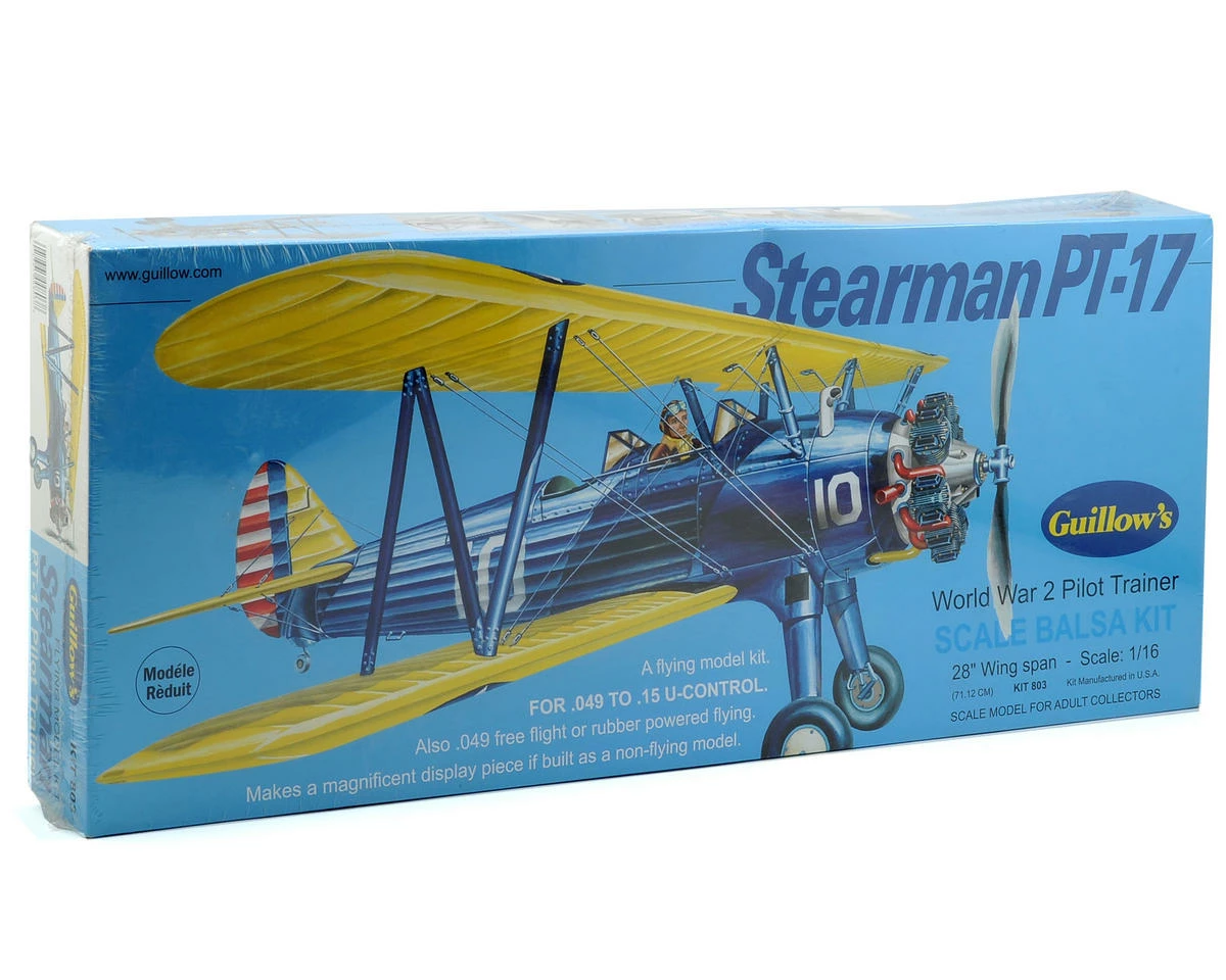 This is the Guillow’s Stearman PT17 Flying Model Kit. The majority of U.S. pilots of World War 2 received their primary flight training in the famous Stearman Trainer. This excellent 2-place biplane was known as the PT-17 when delivered to Army flight training centers. The Navy designations were N2S-1 and N2S-4. Nearly 3,000 were built in the 1940-43 period and, in the post war era and up to modern times, the Stearman Trainer has been successfully used as a stunt plane and crop duster.
