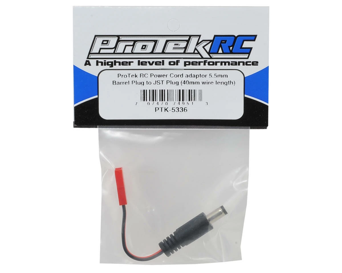 This is a 40mm ProTek R/C Power Cord Adapter, intended for use with SkyZone and Fat Shark Goggles. This adapter features a male 5.5mm barrel plug on one end and a female JST plug on the other. This adapter allows a JST Plug equipped battery back to power SkyZone or Fat Shark FPV Goggles.
