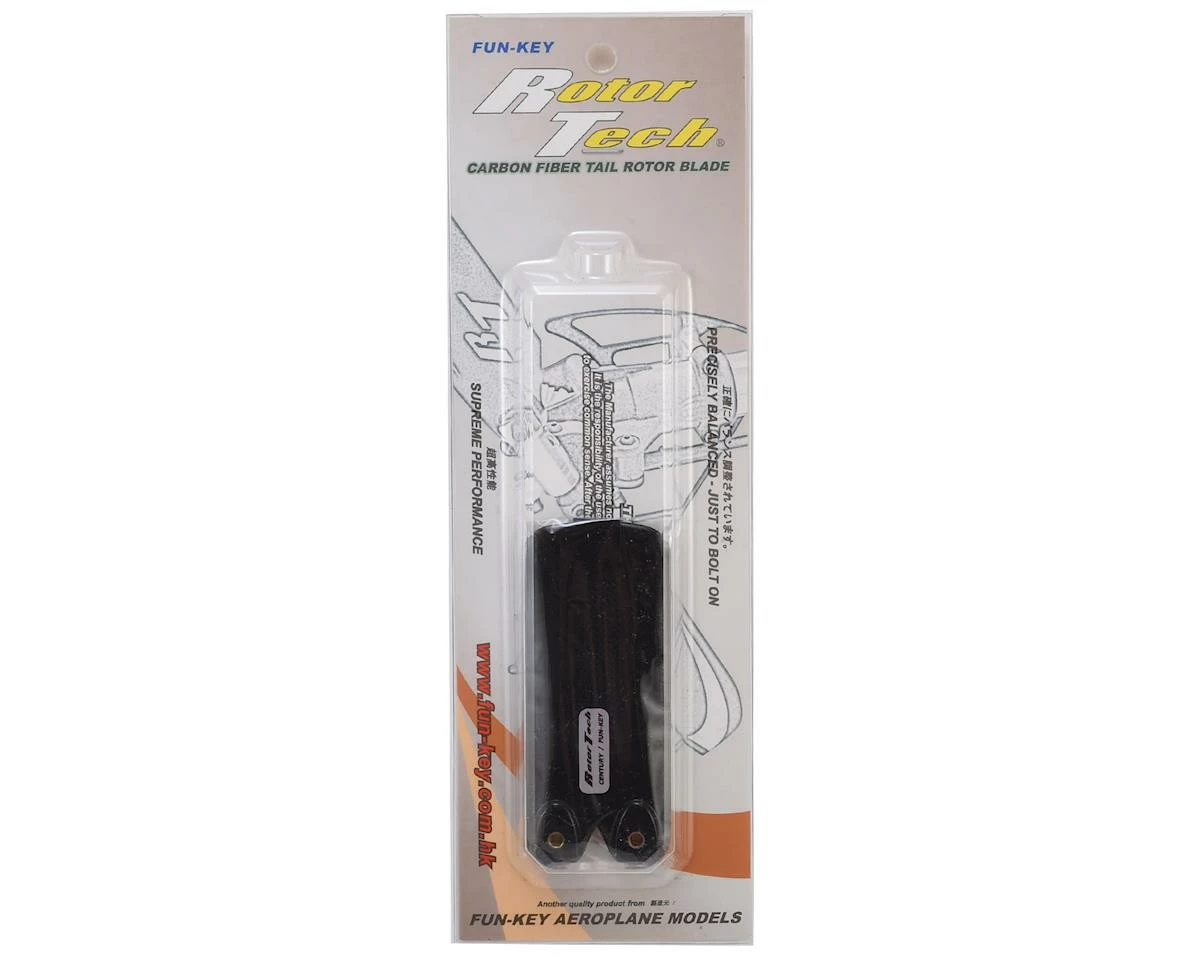 RotorTech blades are finely crafted premium carbon fiber rotor blades from Fun-Key Aeroplane Models. RotorTech blades are designed to be an all around powerful, efficient, well rounded performance oriented blade that will suite a large majority of flight styles from simple aerobatics, F3C, and extreme 3D flight. Additionally, RotorTech blades utilize a minimal amount of paint within the mold, while still providing excellent flight visibility. By using less weight on all of their blades, weight is saved on each set which offers a small boost in performance.