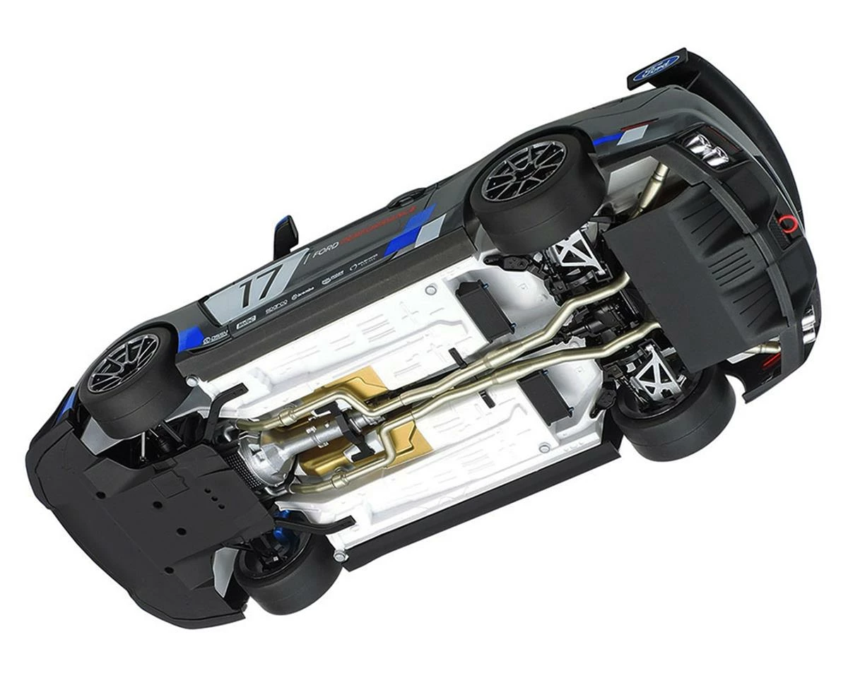 This is a Tamiya 1/24 Ford Mustang GT4 Model Kit. This kit recreates FORD’s PERFORMANCE customer race program Ford Mustang GT4 race car. The actual car is a race-ready powerhouse featuring honed aerodynamic form with front spoiler, rear wing and diffuser, high performance brakes, lightweight carbon fiber vented engine hood, roof, door panels and more, plus a big 5.2-liter V8 engine in the front. The model depicted in this kit recreates the 2019 spec car with two Factory Livery schemes in one kit.