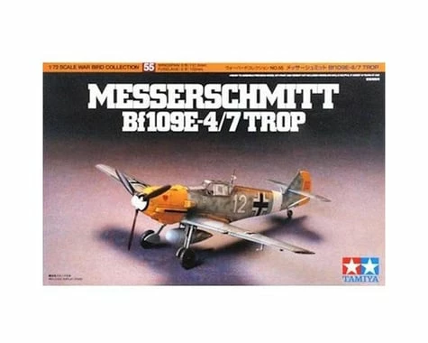 This is a Tamiya 1/72 Scale Bf109 E4/7 Tropical Model Airplane. During the first half of the Second World War, the Messerschmitt Bf109 E was the main fighter of the German airforce. The E-4 housed a 1,100hp Daimler Benz DB 601Aa engine and was armed with two 7.92mm machine guns on the nose, as well as a 20mm cannon on each wing. For some aircraft, bullet-proof glass was used to reinforce the front of the canopy. In addition, a 20mm canon, which ran through a tube in the propeller was supposed to be installed but was unsuccessful. Displaying superb acceleration and diving ability, the E-type planes overpowered the RAF’s Hawker hurricane and equaled the Spitfire fighters in the Battle of Britain. However, with a flight range of only 560km, the E-4 planes were limited to just fifteen minutes of combat over British skies. Thus, the bombers were not given sufficient support and sustained heavy damage. As a result, the Luftwaffe’s strategy to bomb England into surrender ended in failure. To deal with this drawback, the E-4 planes were equipped with additional 300L fuel tank. These improved fighters, called E-7, were first deployed at the end of 1940. After the Battle of Britain, the E-4/7 planes were sent to the front lines of Northern Africa. As the Bf109 F-type fighter’s production was advanced, the E-4/7 was retired from the front lines. However, some veteran pilots continued to use the E-4/7 mainly for ground support duty until the summer of 1942.