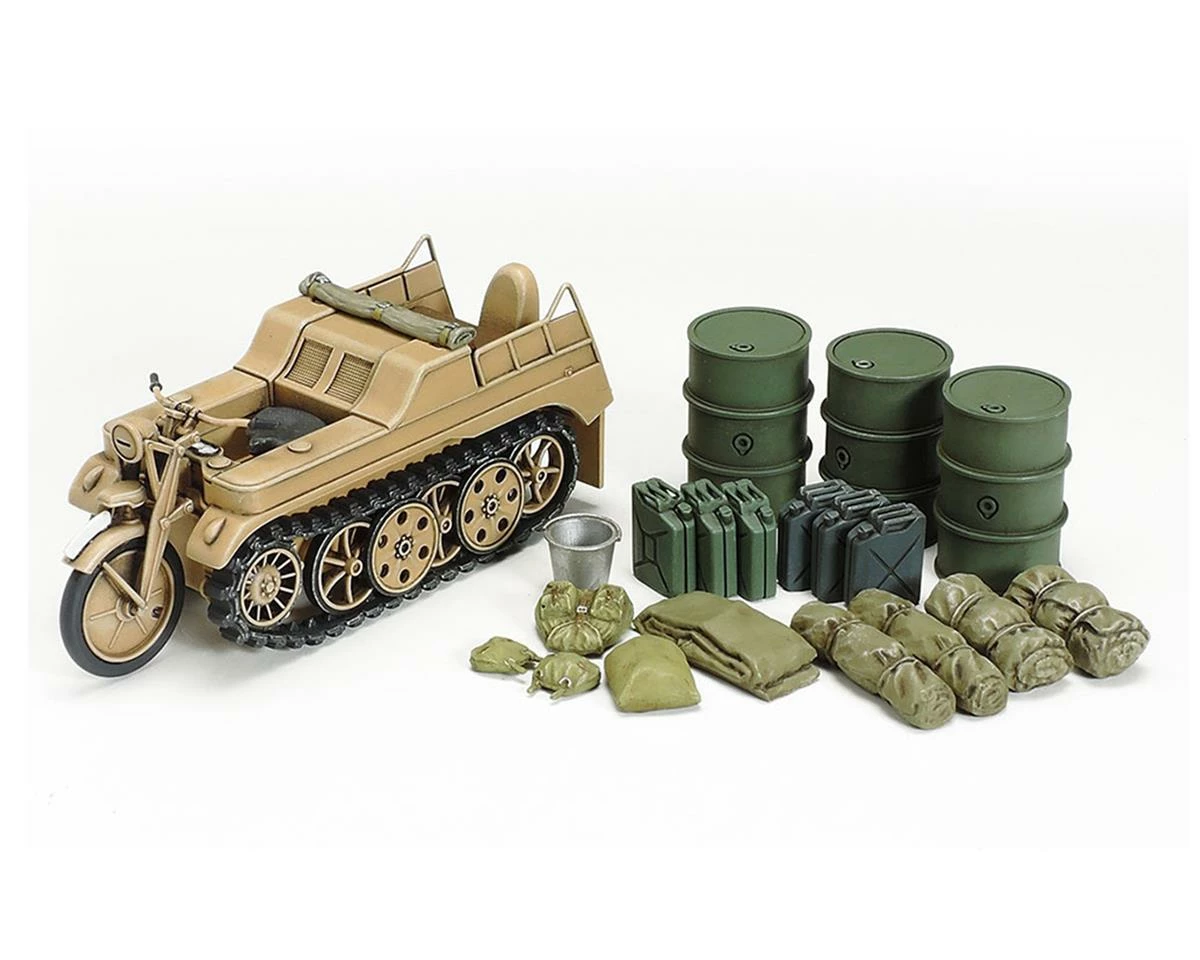 - Includes Tamiya parts to recreate the Kettenkraftrad and accessories such as oil drums, jerry cans, folded sheets, buckets and more