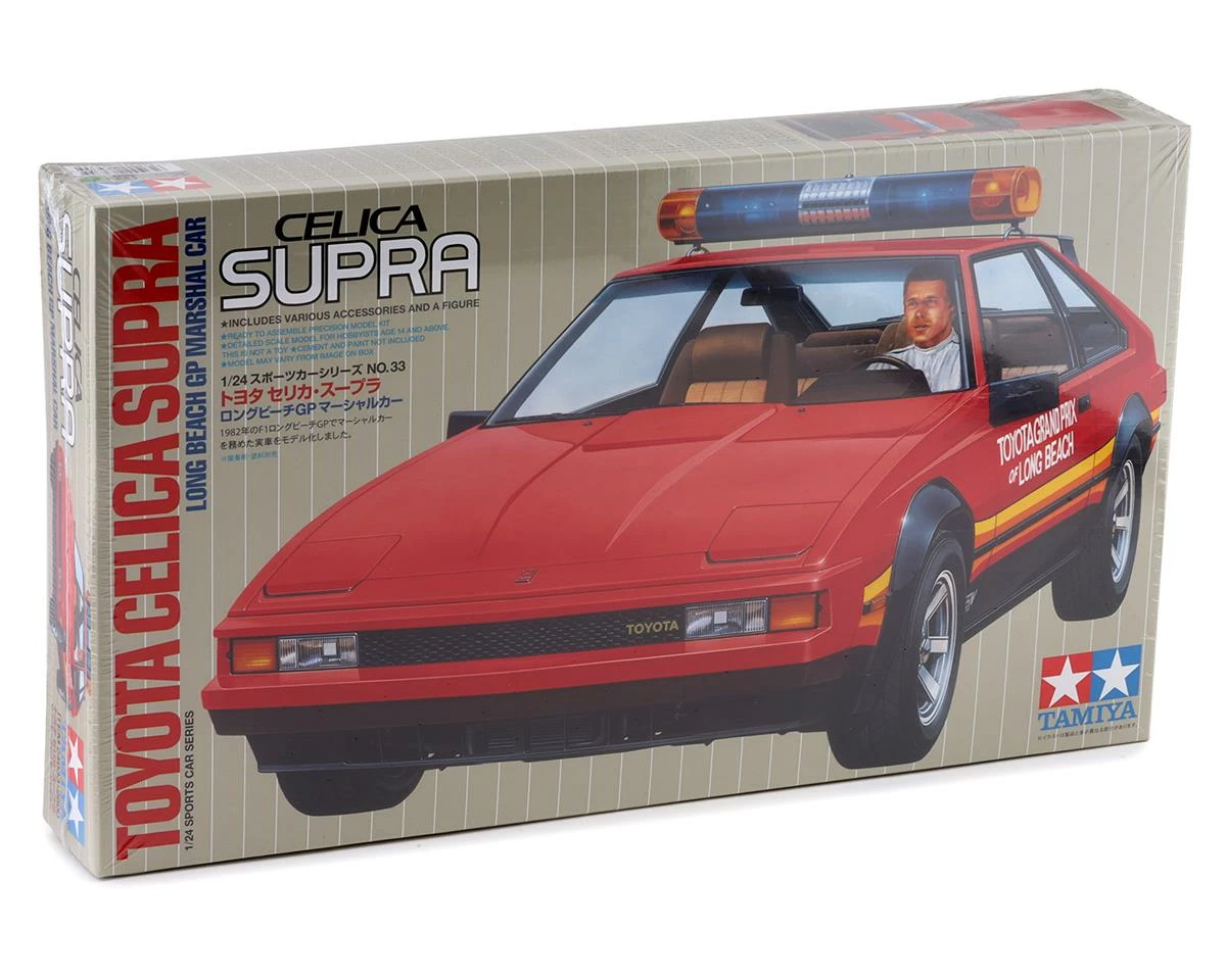 The Tamiya Toyota Celica Supra Long Beach GP Marshall 1/24 Model Kit is a re-issue that recreates the classic Toyota Celica Supra from 1983, which depicts a special version of the Celica Supra that was used as the race marshal’s car in the 1982 Formula One race held in Long Beach, California, USA. Its tuned engine produced 230hp and a top speed of over 230km/h. The car made for a thrilling sight as it bombed around the circuit, thanks to over-sized fenders and a sporty rear spoiler!