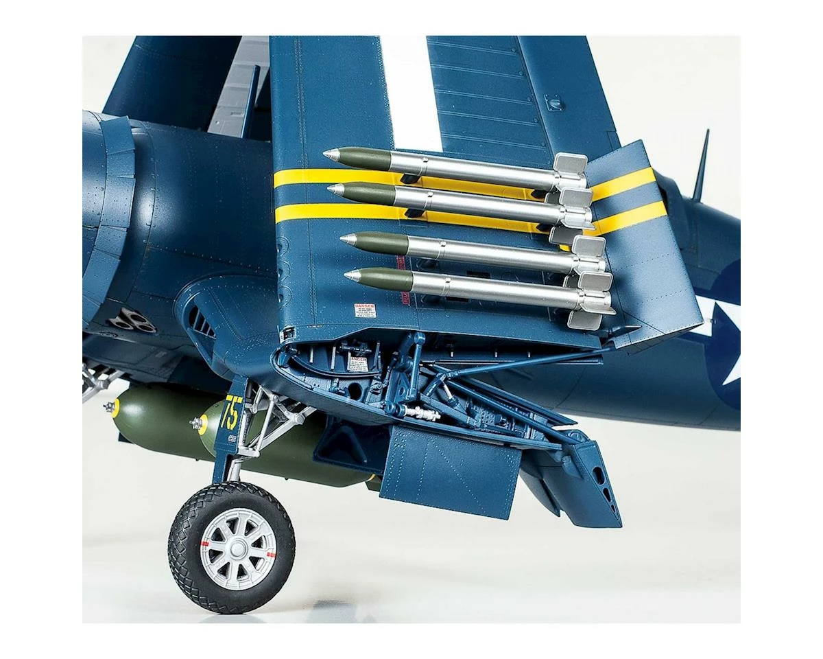 The Tamiya Vought F4U-1D Corsair 1/32 Airplane Model Kit is a replica of the D variant of the popular Corsair World War II fighter plane. It uses specific parts to recreate the features of the F4U-1D, which was the first Corsair to be cleared for use on aircraft carriers. This fighter-bomber could carry drop tanks on new hard points under the wing root, and up to 8 rockets under the outer wing. It provided invaluable close support for ground troops during landings in places such as the Philippines and Okinawa, and continued to serve after WWII, in Korea.